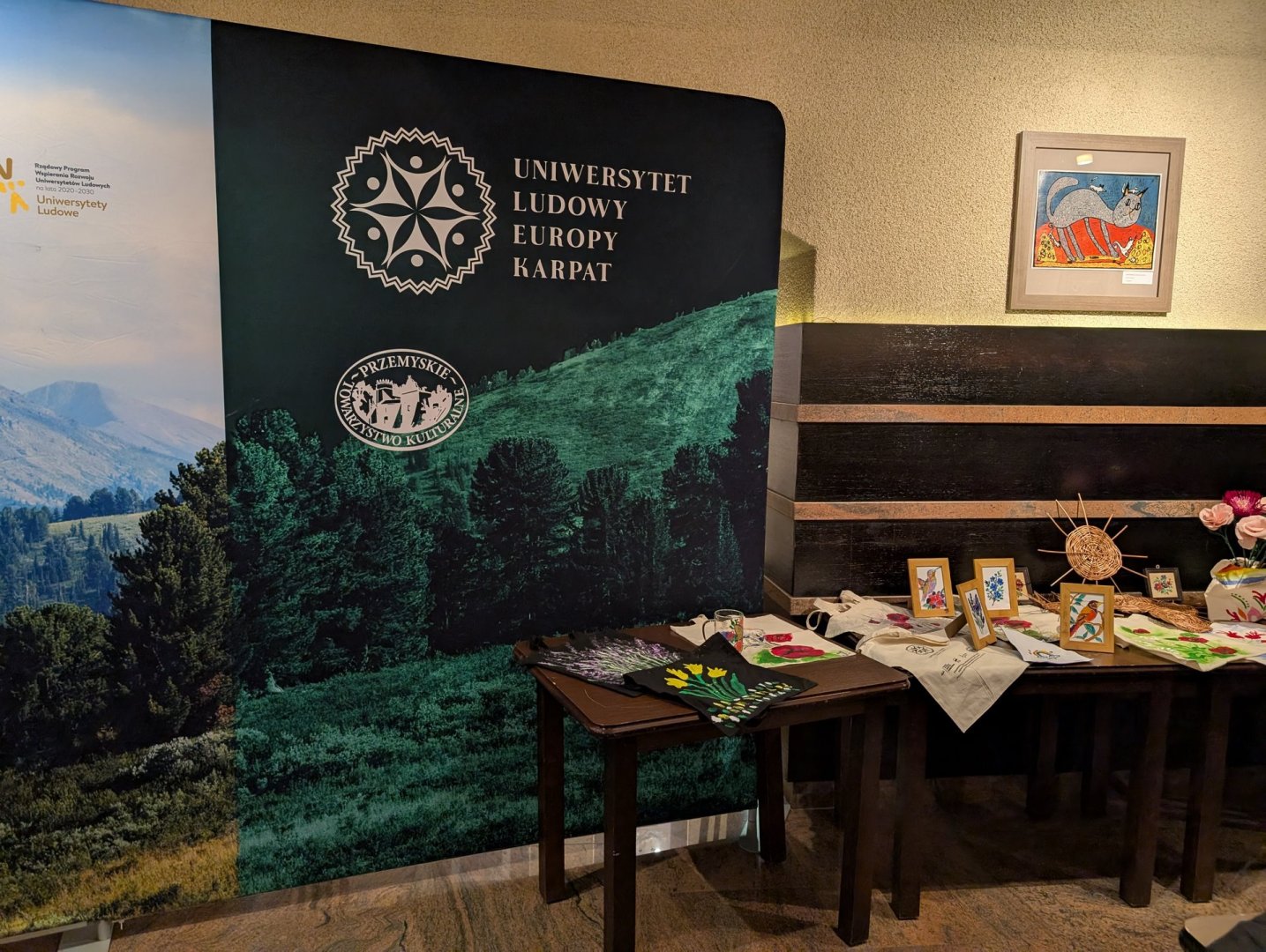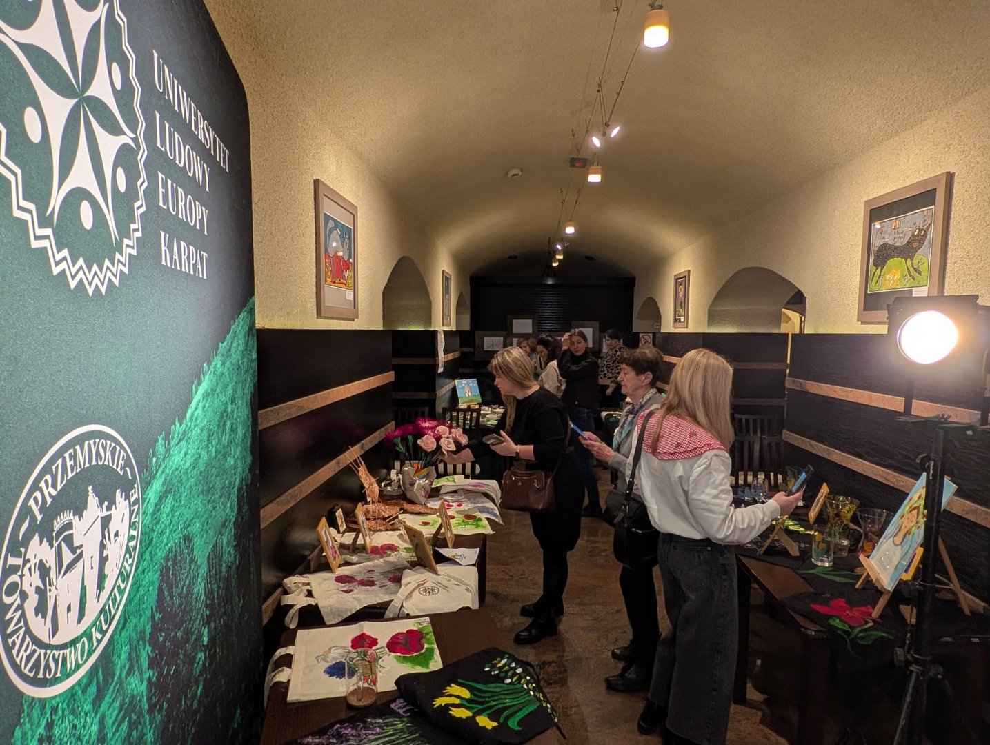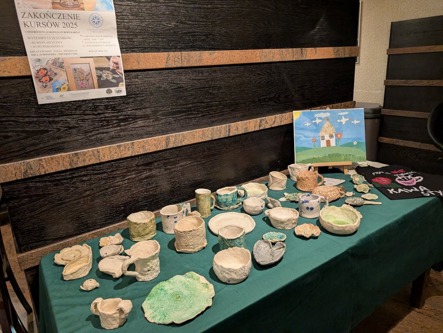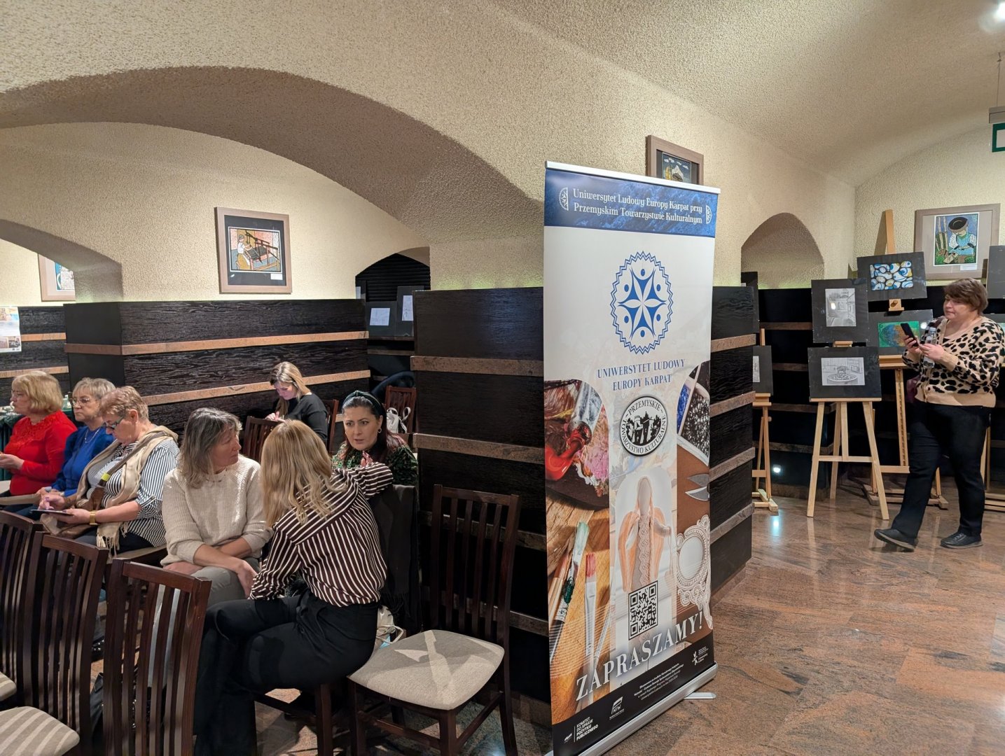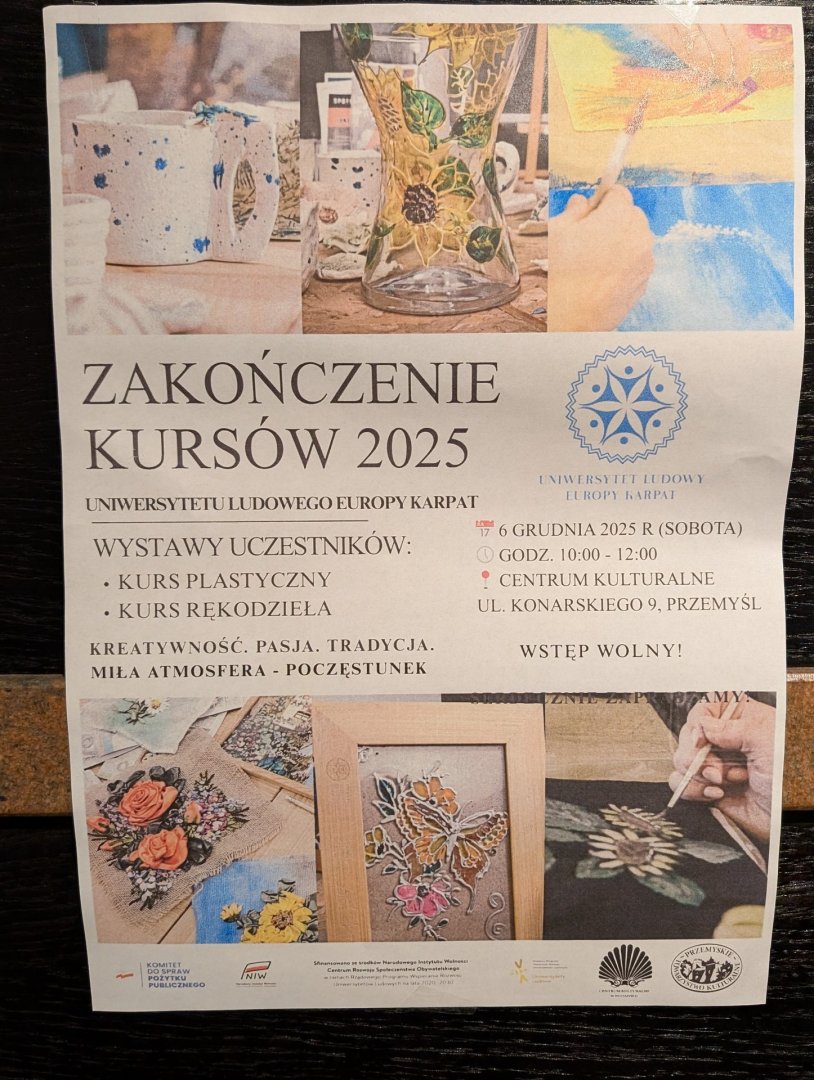 6 grudnia 2025 roku w świątecznej atmosferze Mikołajek, w Klubie „Piwnice” Centrum Kulturalnego w Przemyślu odbyło się uroczyste zakończenie dwóch długoterminowych kursów prowadzonych przez Uniwersytet Ludowy Europy Karpat: kursu plastycznego oraz kursu rękodzieła artystycznego. Spotkaniu towarzyszyła wystawa prac uczestników, którzy przez kilka miesięcy rozwijali swoje umiejętności pod okiem doświadczonych instruktorów. W przestrzeni klubu zaprezentowano ceramikę, kompozycje z bibuły, hafty, malowanie na tkaninach i szkle, a także liczne prace powstałe podczas zajęć akwarelowych i plenerowych. Całość ukazywała różnorodność technik i indywidualność twórców, a także ogromne znaczenie, jakie ma pielęgnowanie tradycji i rozwijanie kreatywności w lokalnej społeczności.