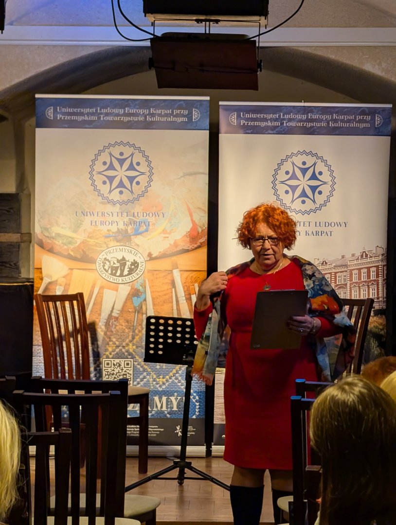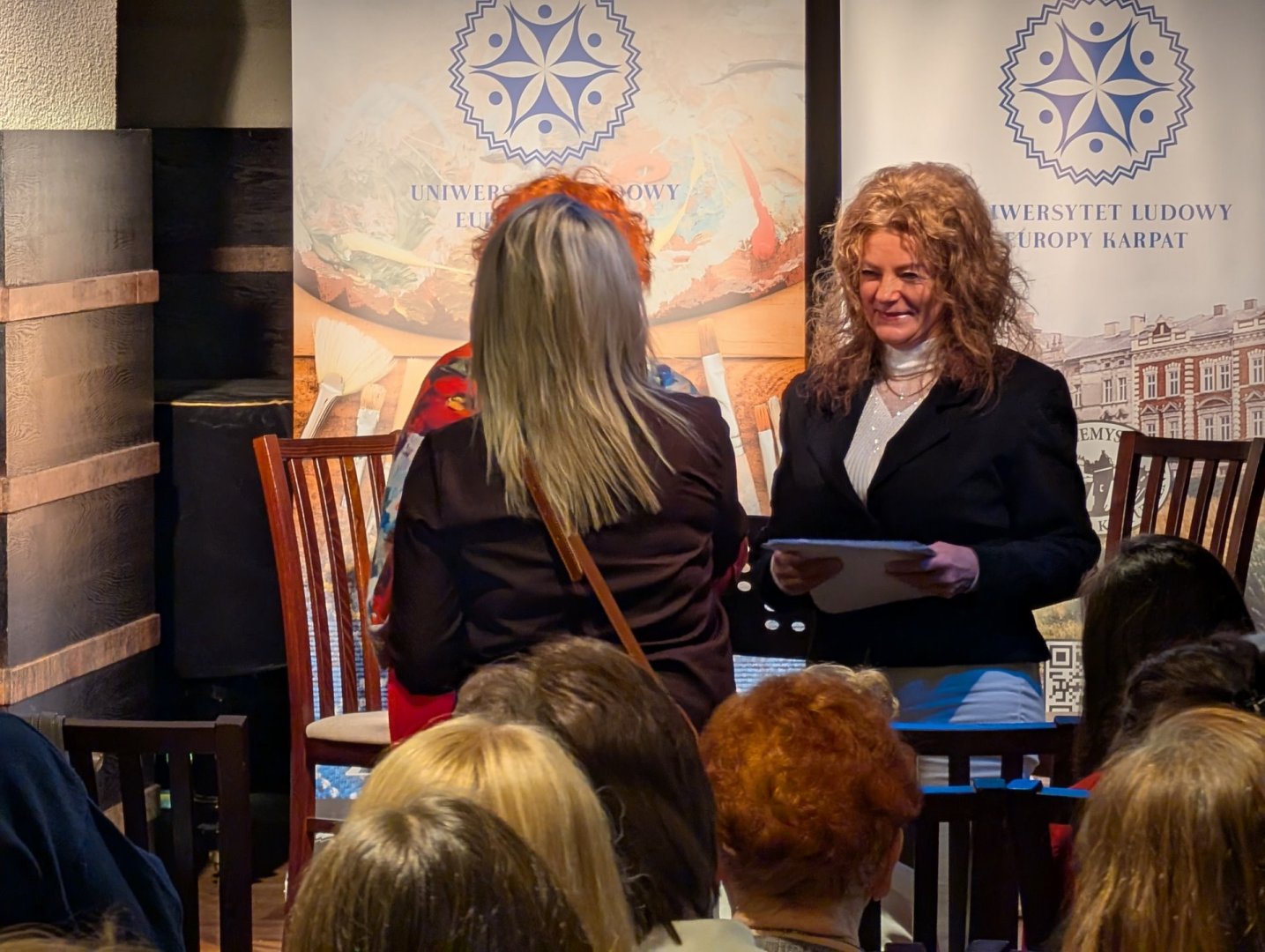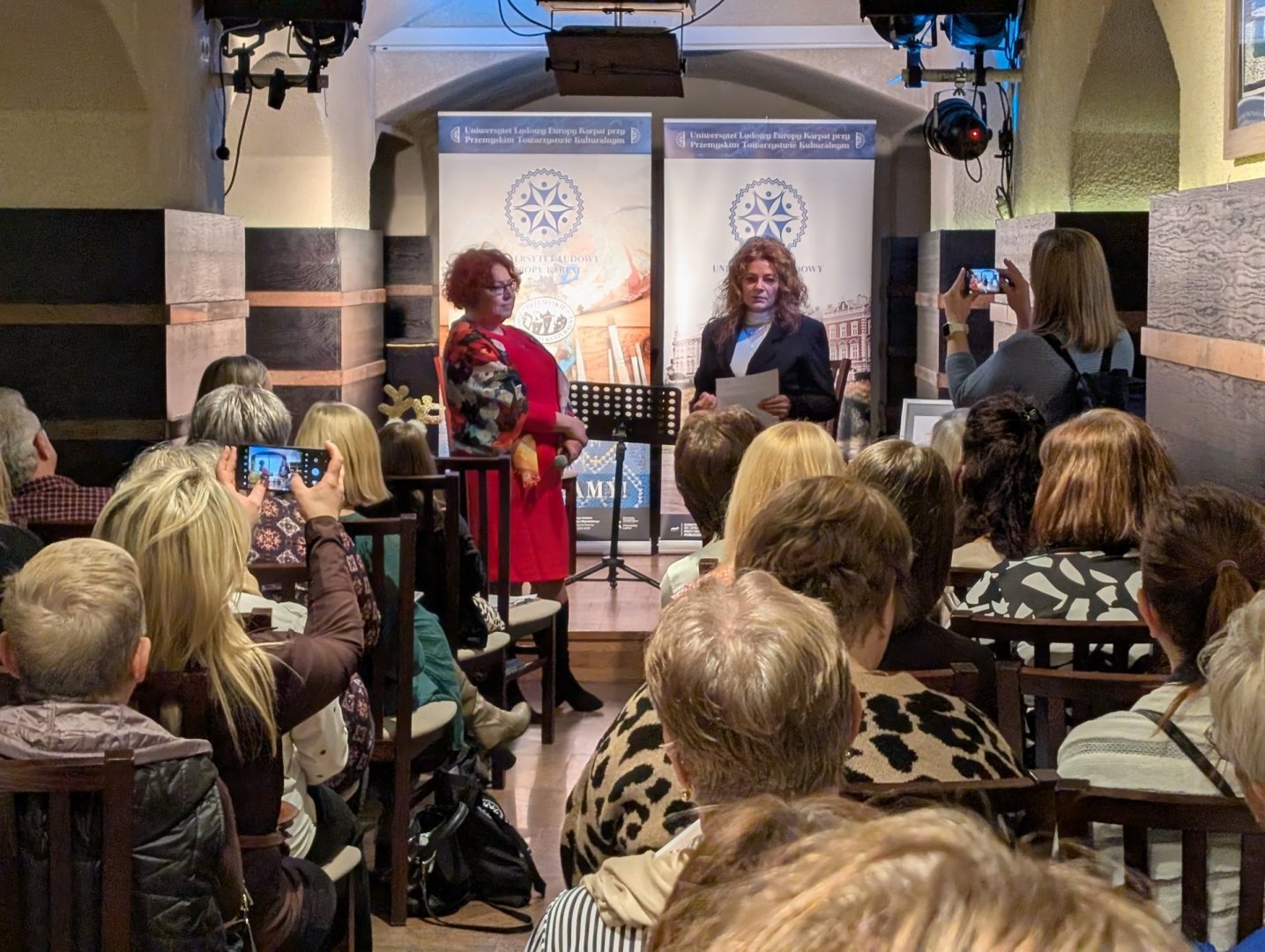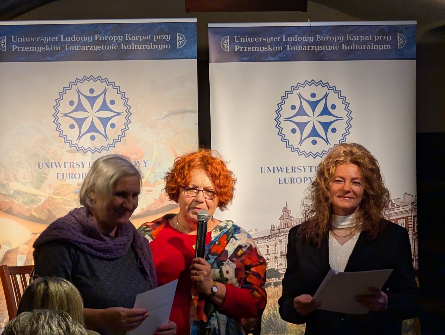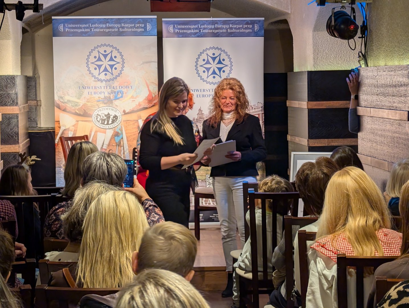 6 grudnia 2025 roku w świątecznej atmosferze Mikołajek, w Klubie „Piwnice” Centrum Kulturalnego w Przemyślu odbyło się uroczyste zakończenie dwóch długoterminowych kursów prowadzonych przez Uniwersytet Ludowy Europy Karpat: kursu plastycznego oraz kursu rękodzieła artystycznego. Spotkaniu towarzyszyła wystawa prac uczestników, którzy przez kilka miesięcy rozwijali swoje umiejętności pod okiem doświadczonych instruktorów. W przestrzeni klubu zaprezentowano ceramikę, kompozycje z bibuły, hafty, malowanie na tkaninach i szkle, a także liczne prace powstałe podczas zajęć akwarelowych i plenerowych. Całość ukazywała różnorodność technik i indywidualność twórców, a także ogromne znaczenie, jakie ma pielęgnowanie tradycji i rozwijanie kreatywności w lokalnej społeczności.