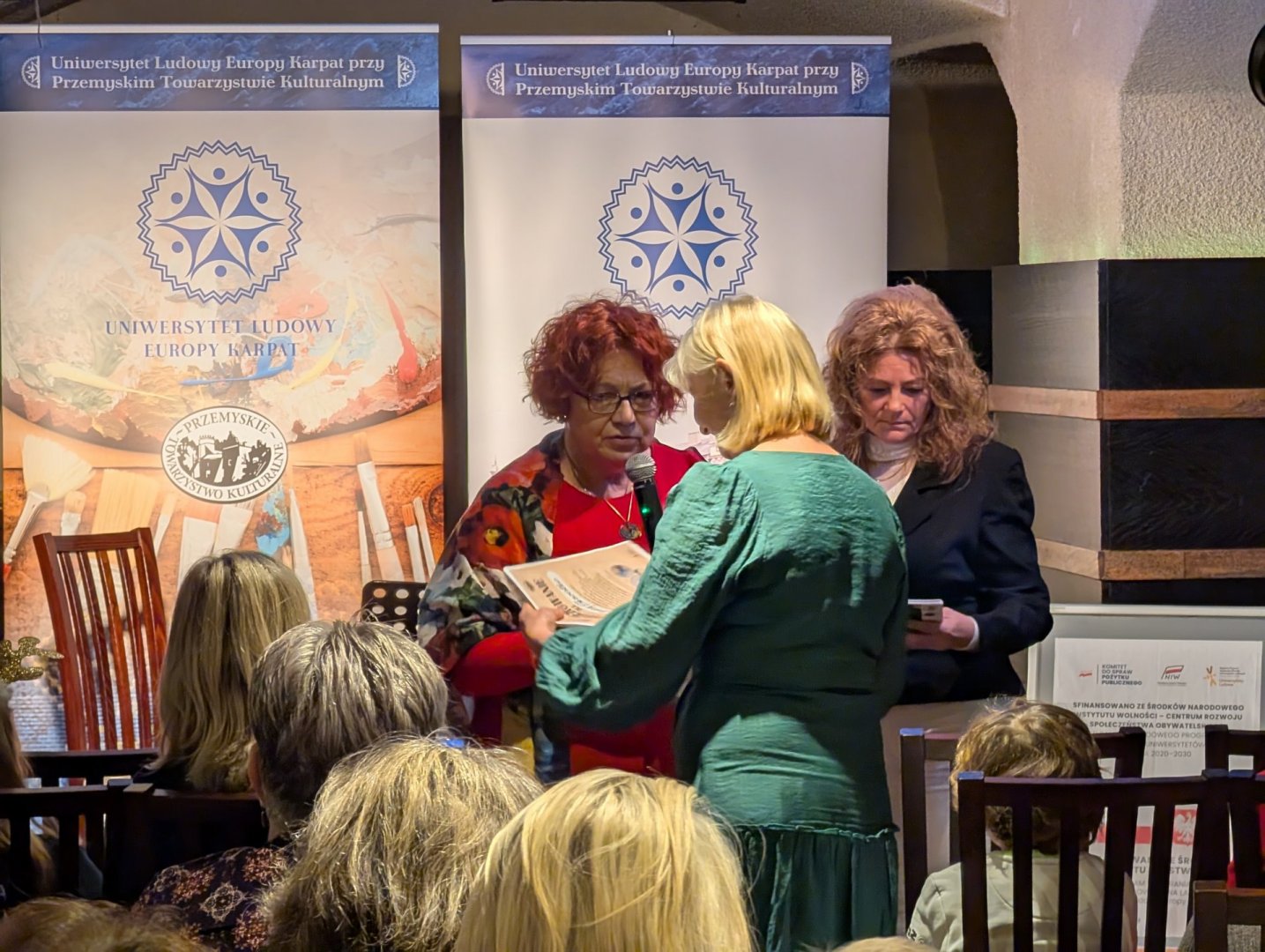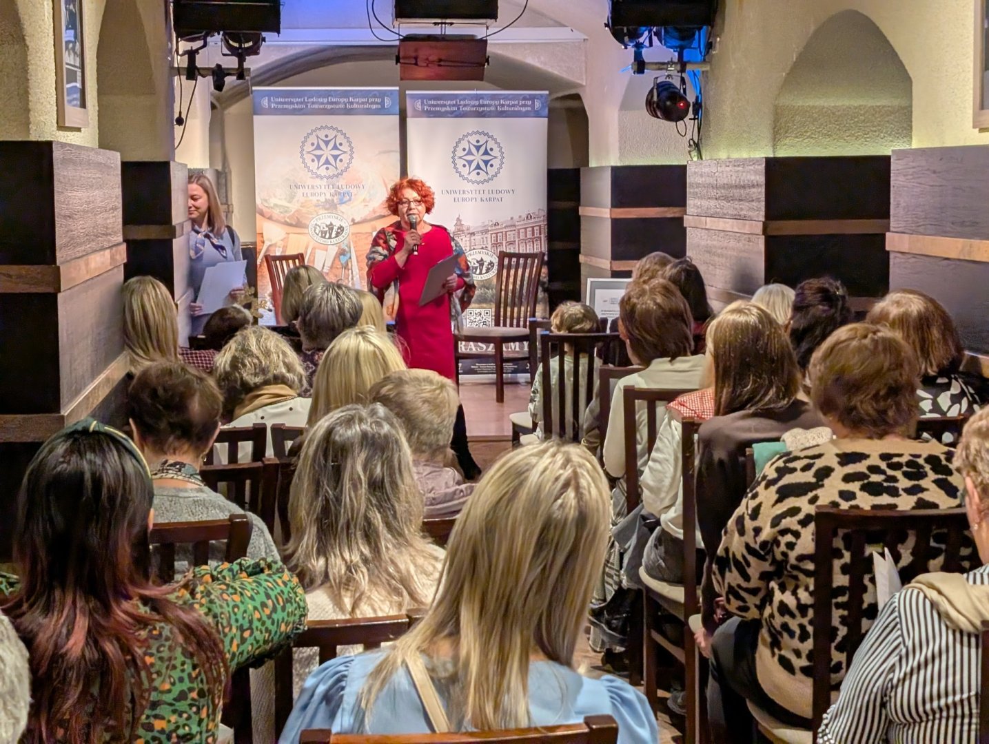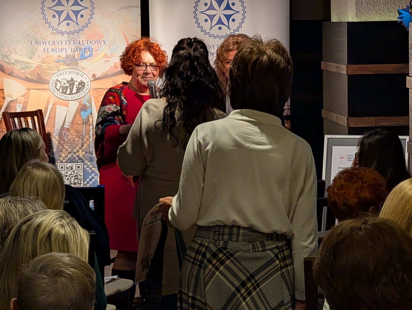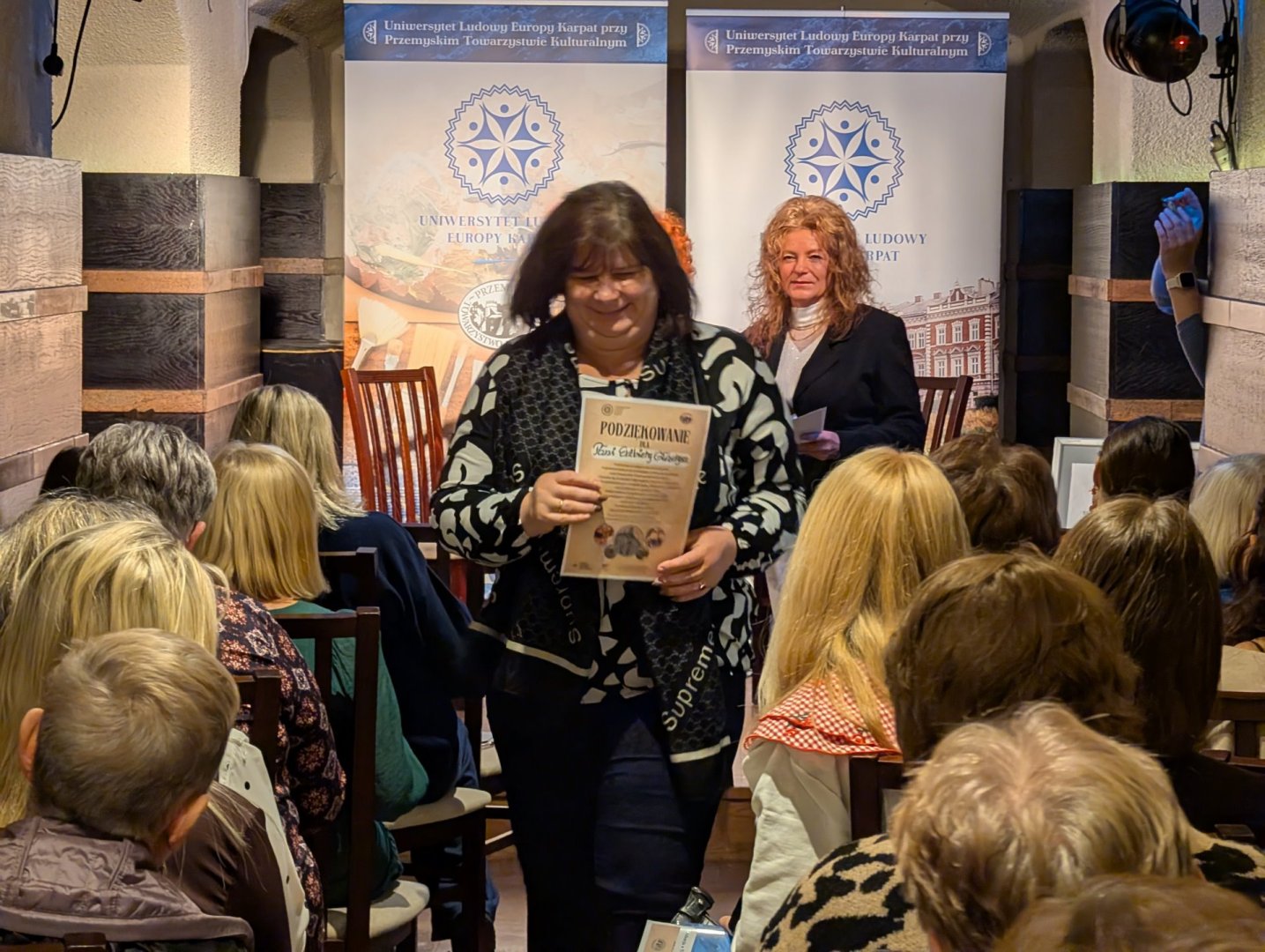 6 grudnia 2025 roku w świątecznej atmosferze Mikołajek, w Klubie „Piwnice” Centrum Kulturalnego w Przemyślu odbyło się uroczyste zakończenie dwóch długoterminowych kursów prowadzonych przez Uniwersytet Ludowy Europy Karpat: kursu plastycznego oraz kursu rękodzieła artystycznego. Spotkaniu towarzyszyła wystawa prac uczestników, którzy przez kilka miesięcy rozwijali swoje umiejętności pod okiem doświadczonych instruktorów. W przestrzeni klubu zaprezentowano ceramikę, kompozycje z bibuły, hafty, malowanie na tkaninach i szkle, a także liczne prace powstałe podczas zajęć akwarelowych i plenerowych. Całość ukazywała różnorodność technik i indywidualność twórców, a także ogromne znaczenie, jakie ma pielęgnowanie tradycji i rozwijanie kreatywności w lokalnej społeczności.