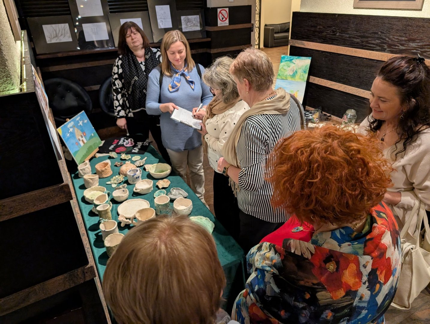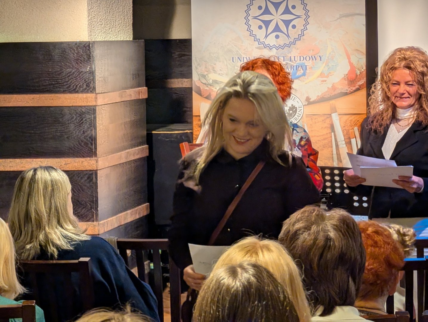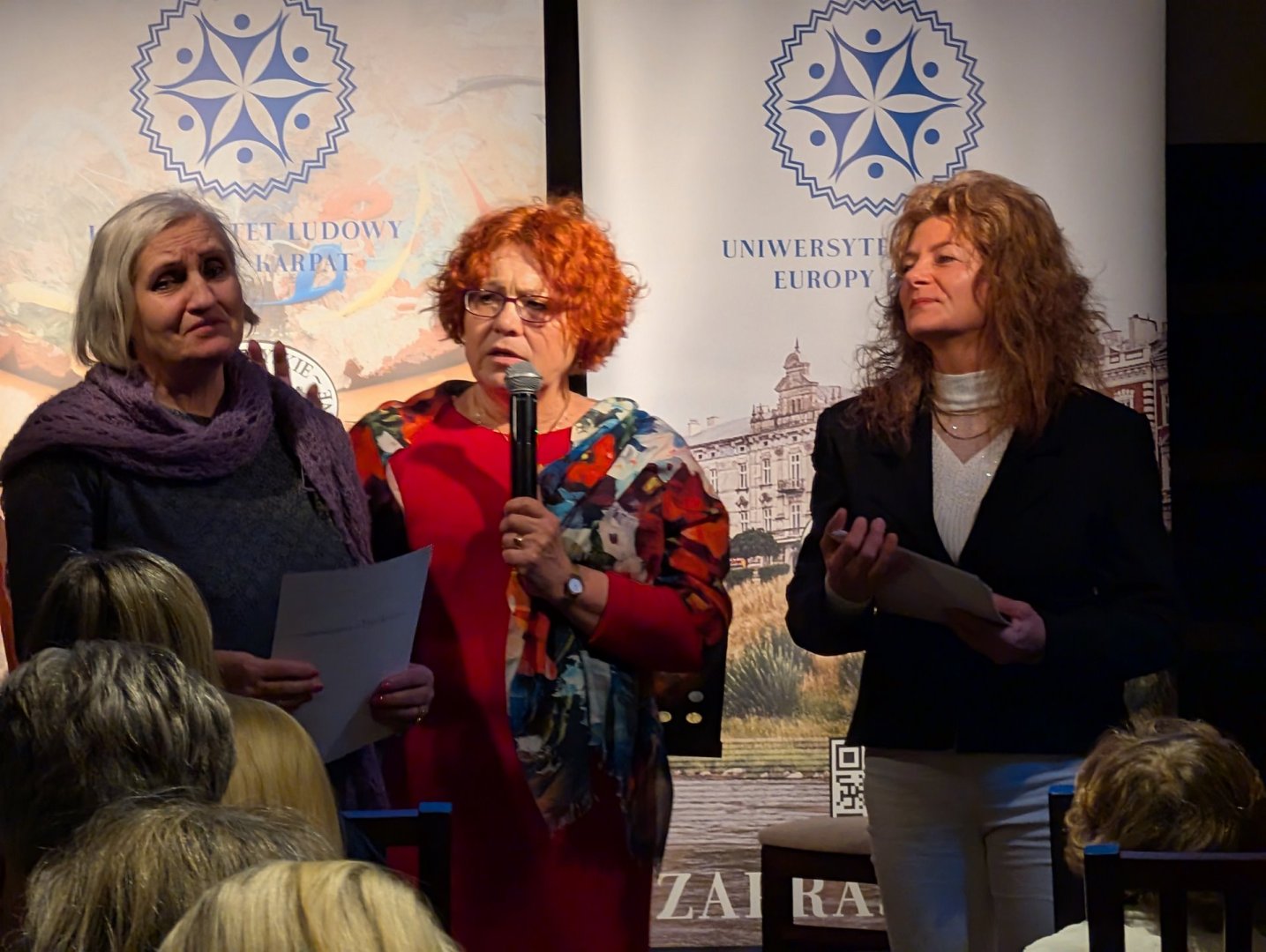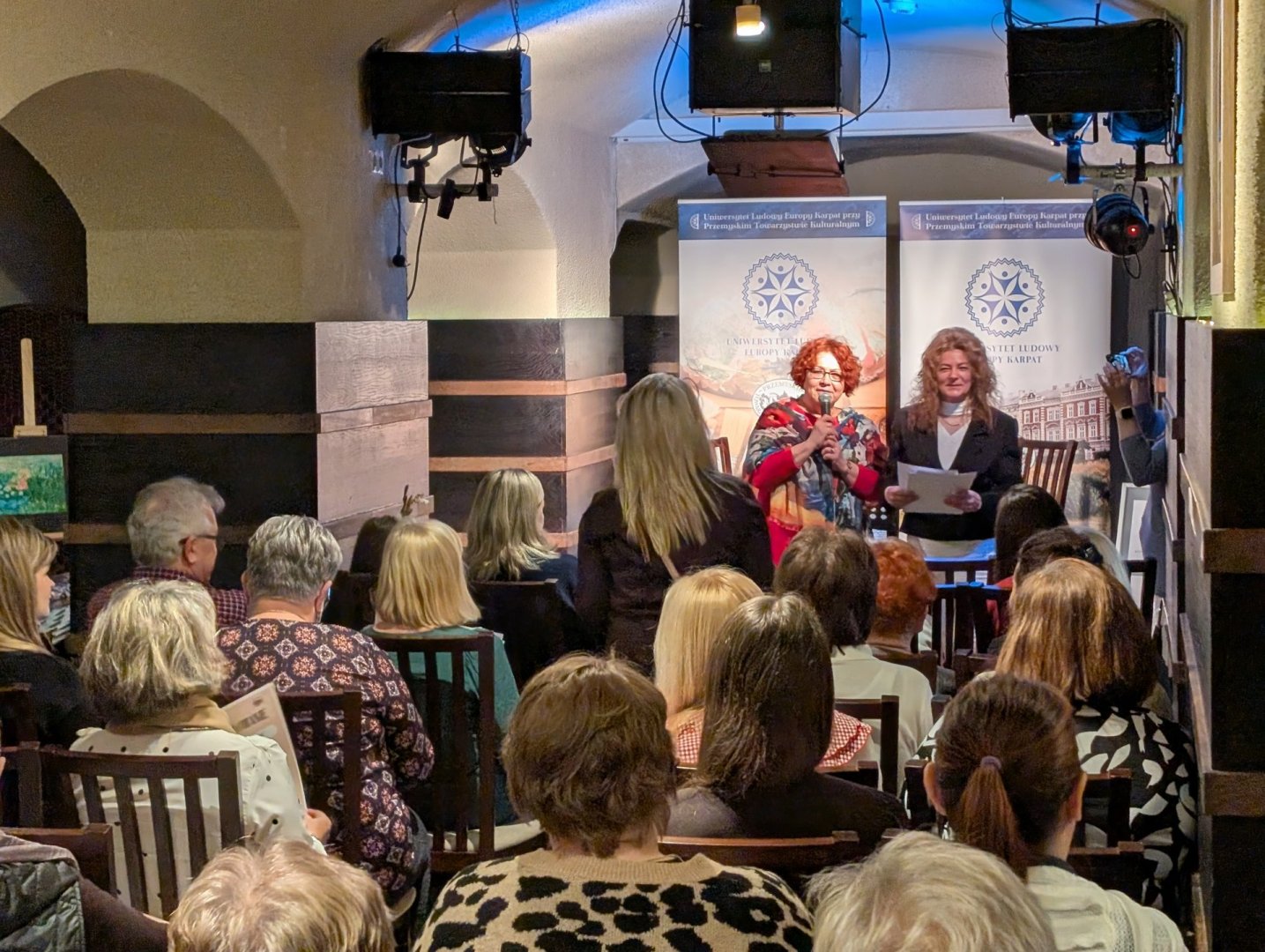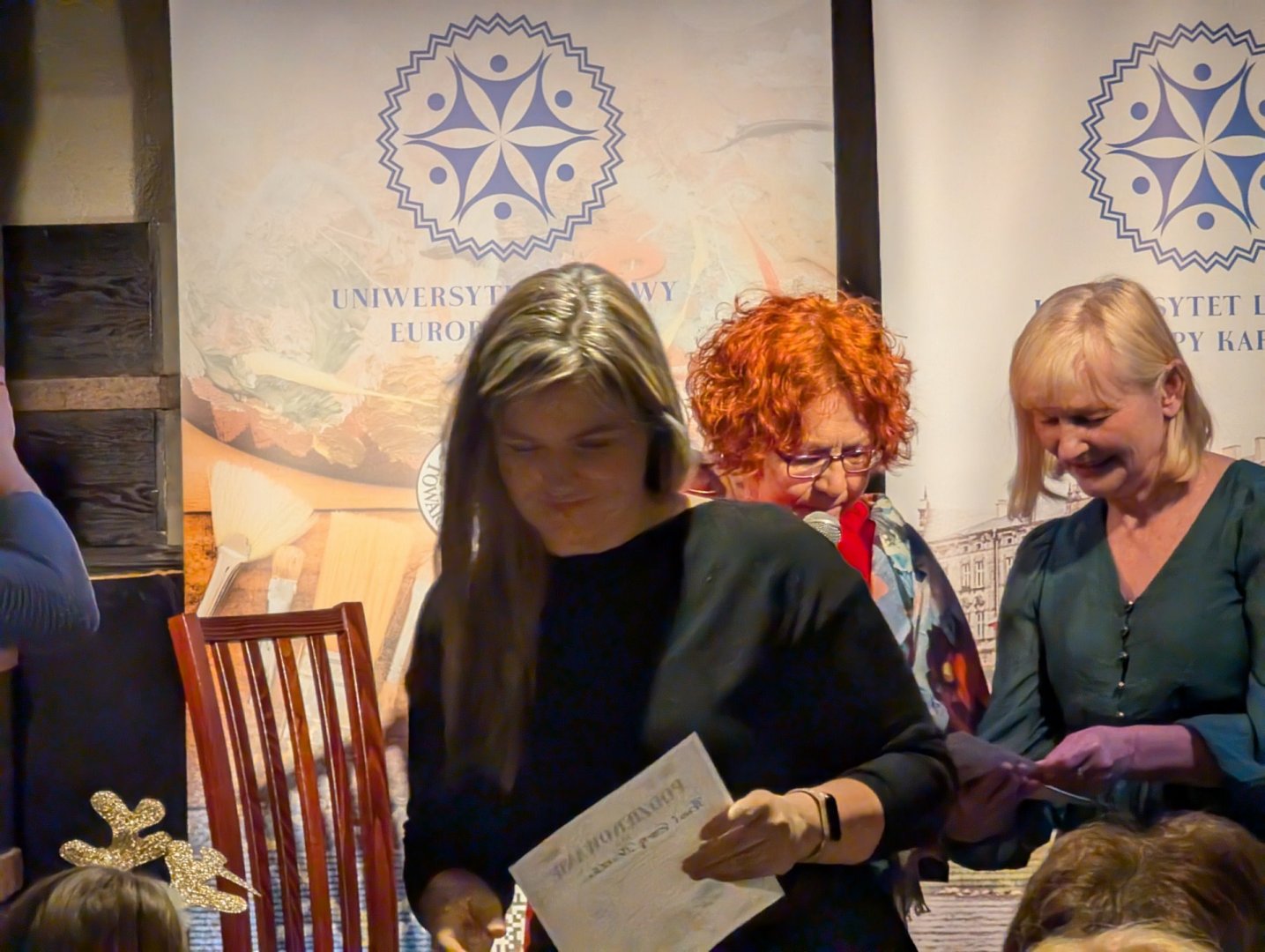 6 grudnia 2025 roku w świątecznej atmosferze Mikołajek, w Klubie „Piwnice” Centrum Kulturalnego w Przemyślu odbyło się uroczyste zakończenie dwóch długoterminowych kursów prowadzonych przez Uniwersytet Ludowy Europy Karpat: kursu plastycznego oraz kursu rękodzieła artystycznego. Spotkaniu towarzyszyła wystawa prac uczestników, którzy przez kilka miesięcy rozwijali swoje umiejętności pod okiem doświadczonych instruktorów. W przestrzeni klubu zaprezentowano ceramikę, kompozycje z bibuły, hafty, malowanie na tkaninach i szkle, a także liczne prace powstałe podczas zajęć akwarelowych i plenerowych. Całość ukazywała różnorodność technik i indywidualność twórców, a także ogromne znaczenie, jakie ma pielęgnowanie tradycji i rozwijanie kreatywności w lokalnej społeczności.