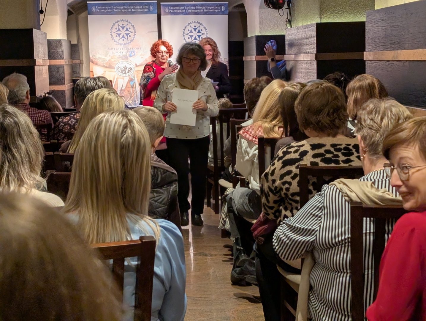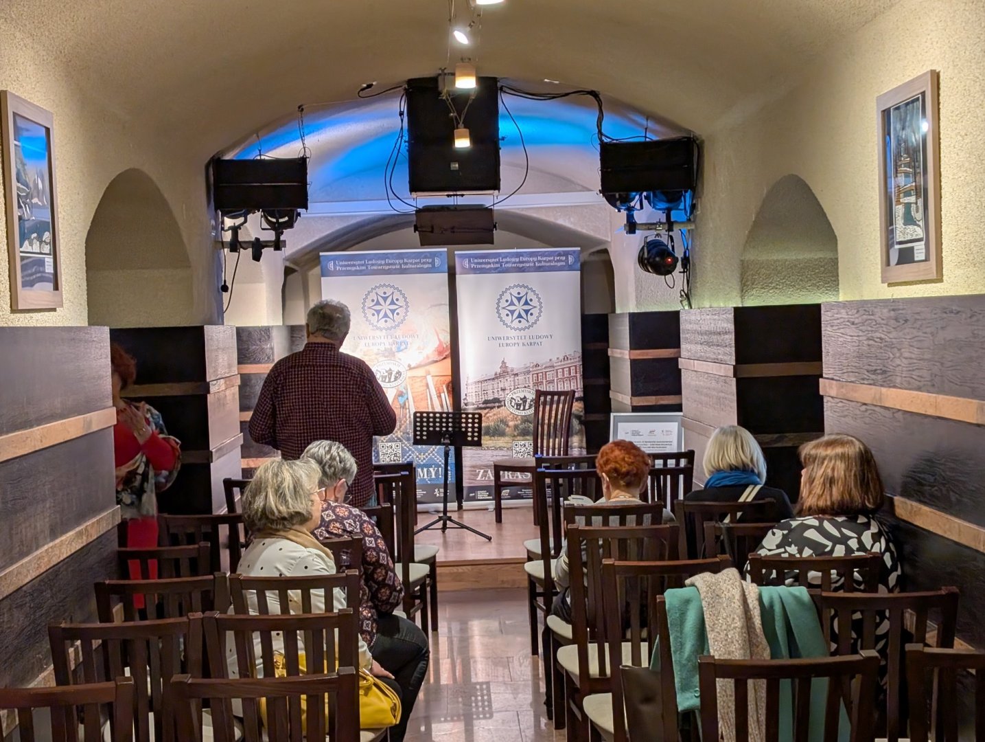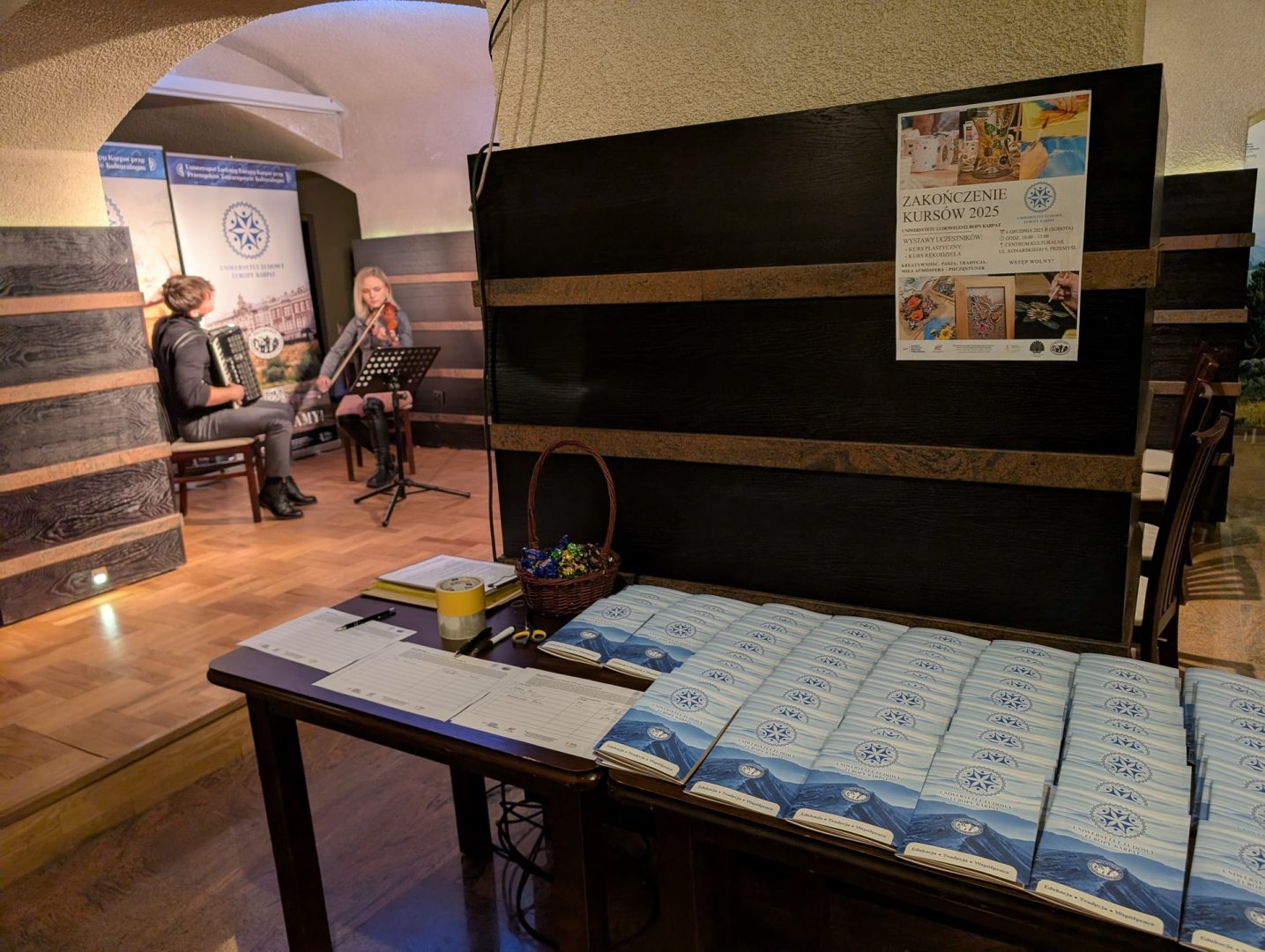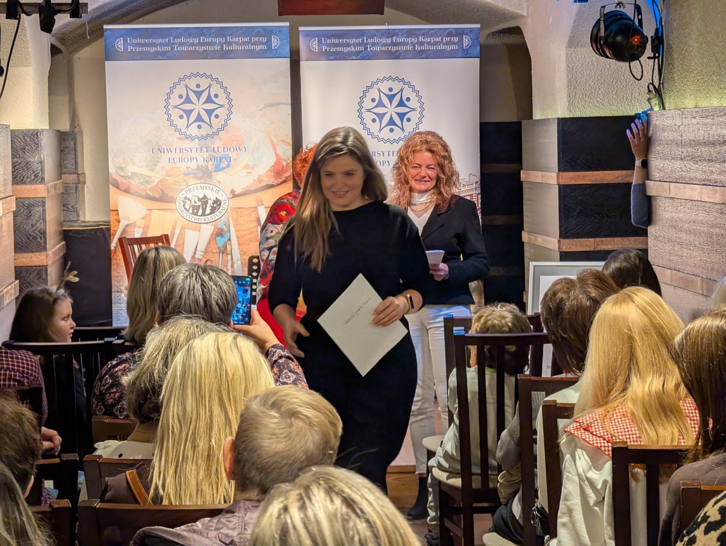 6 grudnia 2025 roku w świątecznej atmosferze Mikołajek, w Klubie „Piwnice” Centrum Kulturalnego w Przemyślu odbyło się uroczyste zakończenie dwóch długoterminowych kursów prowadzonych przez Uniwersytet Ludowy Europy Karpat: kursu plastycznego oraz kursu rękodzieła artystycznego. Spotkaniu towarzyszyła wystawa prac uczestników, którzy przez kilka miesięcy rozwijali swoje umiejętności pod okiem doświadczonych instruktorów. W przestrzeni klubu zaprezentowano ceramikę, kompozycje z bibuły, hafty, malowanie na tkaninach i szkle, a także liczne prace powstałe podczas zajęć akwarelowych i plenerowych. Całość ukazywała różnorodność technik i indywidualność twórców, a także ogromne znaczenie, jakie ma pielęgnowanie tradycji i rozwijanie kreatywności w lokalnej społeczności.